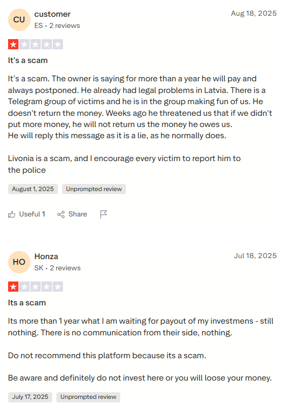 The platform livonia.finance has very poor reviews on Trustpilot and other review sites